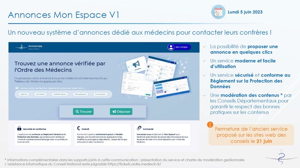 Depuis le 5 juin 2023, le dépôt et la consultation des annonces se font uniquement sur https://monespace.medecin.fr/user/login